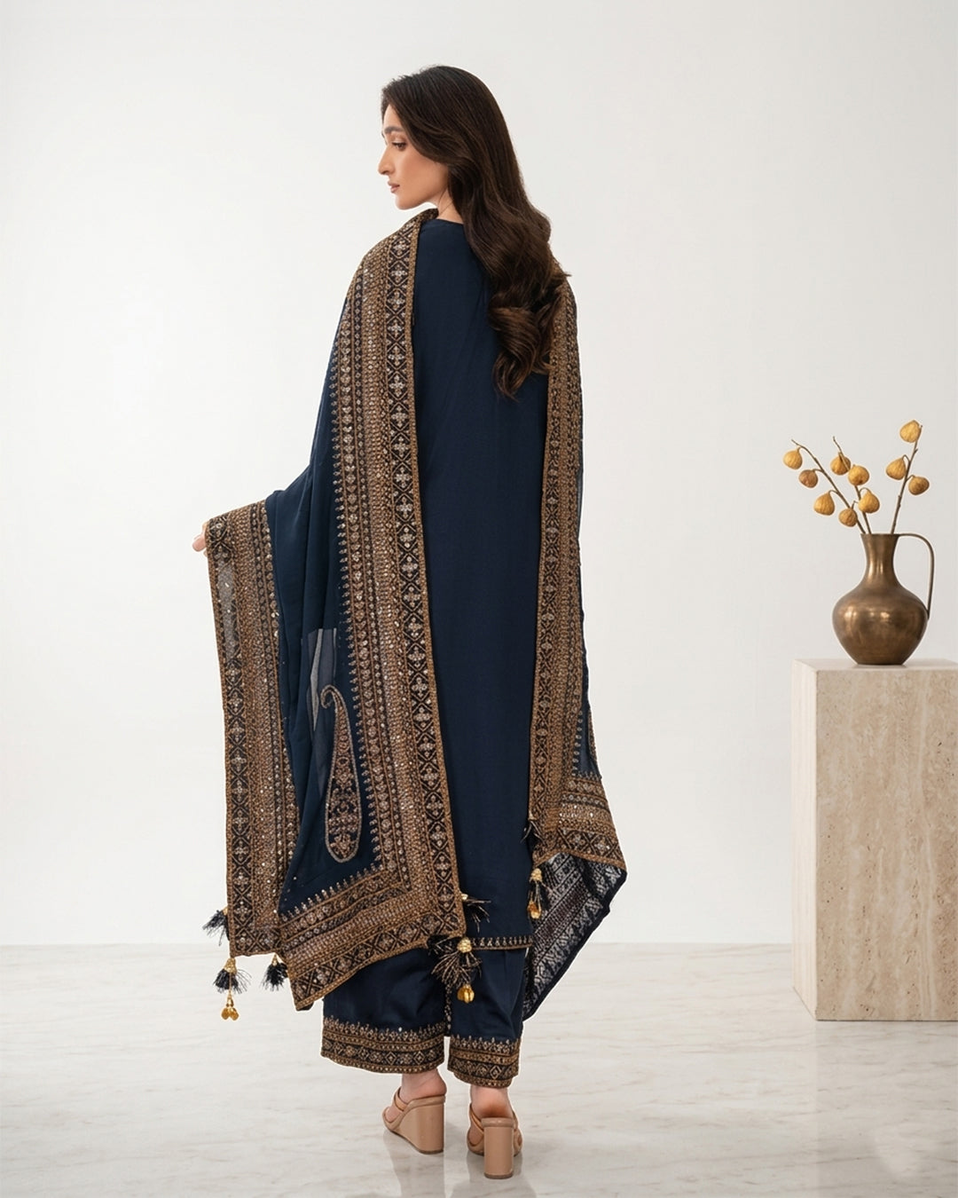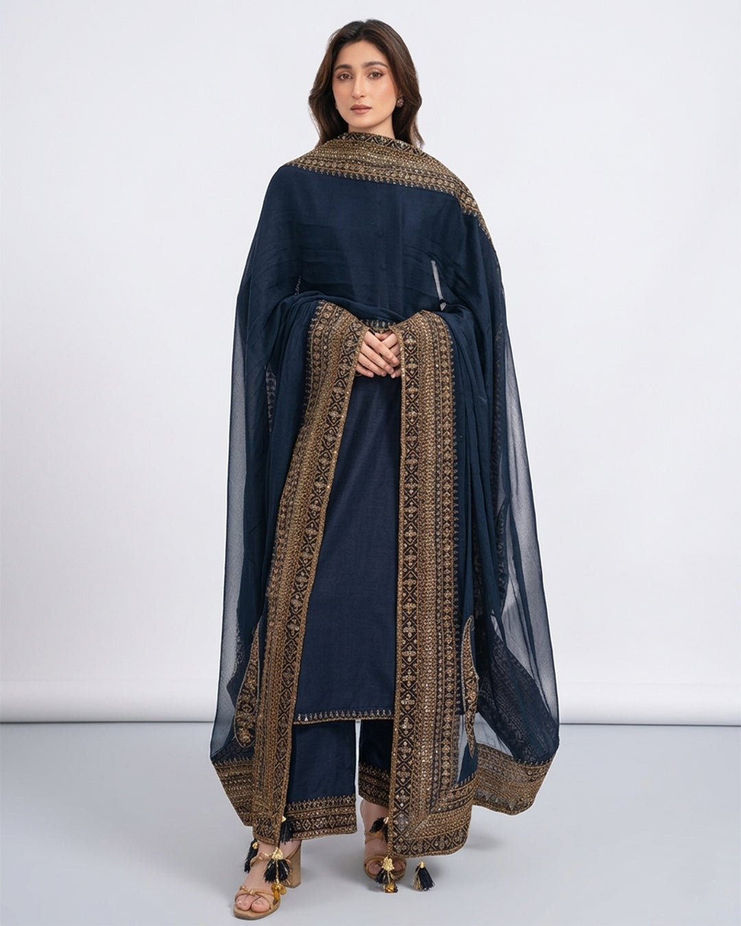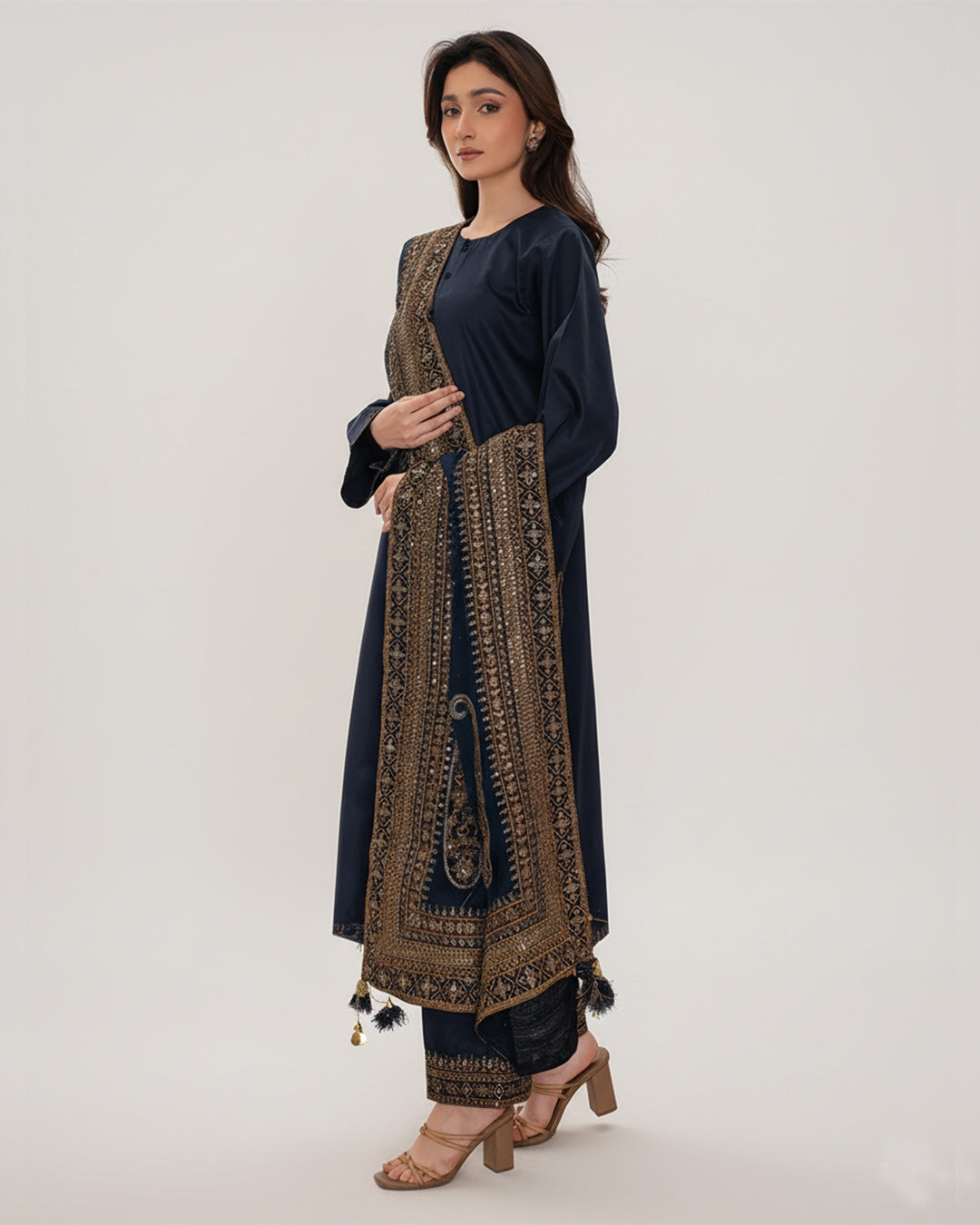 The embroidered shawl is the centerpiece of this look — lavishly decorated with golden threadwork, mirror embellishments, and charming tassels that create a rich, regal aura. The same detailed embroidery graces the borders of the shirt and trousers, making this outfit a harmonious blend of grace and grandeur.